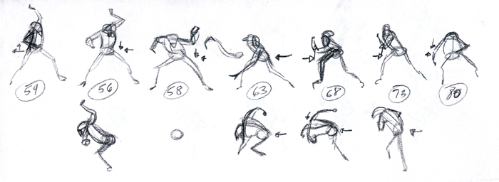 Traditionally, the ideas that swirl about an animator’s head are first laid down as hand drawn sketches, like the one seen above, during a title's Pre-Production phase. Each character’s key frames are illustrated so that poses and lines can be explored and so the animation team can gain a sense of how each character should or shouldn’t move.
